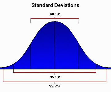 When sample sizes are at least 100, if the results are quantified and displayed on a graph, the results will tend to approximate what is called the "normal curve" of distribution. That is, the majority of people will give you an "average" response, a smaller number will give you a "below average" or an "above average" response, and a very small number will give you an "exceptionally below average" or an "exceptionally above average" response. This distribution is also known as a bell curve. The mathematical probability that a given test observation will fall within a range of values from the middle of this normal distribution curve is called a "standard deviation."